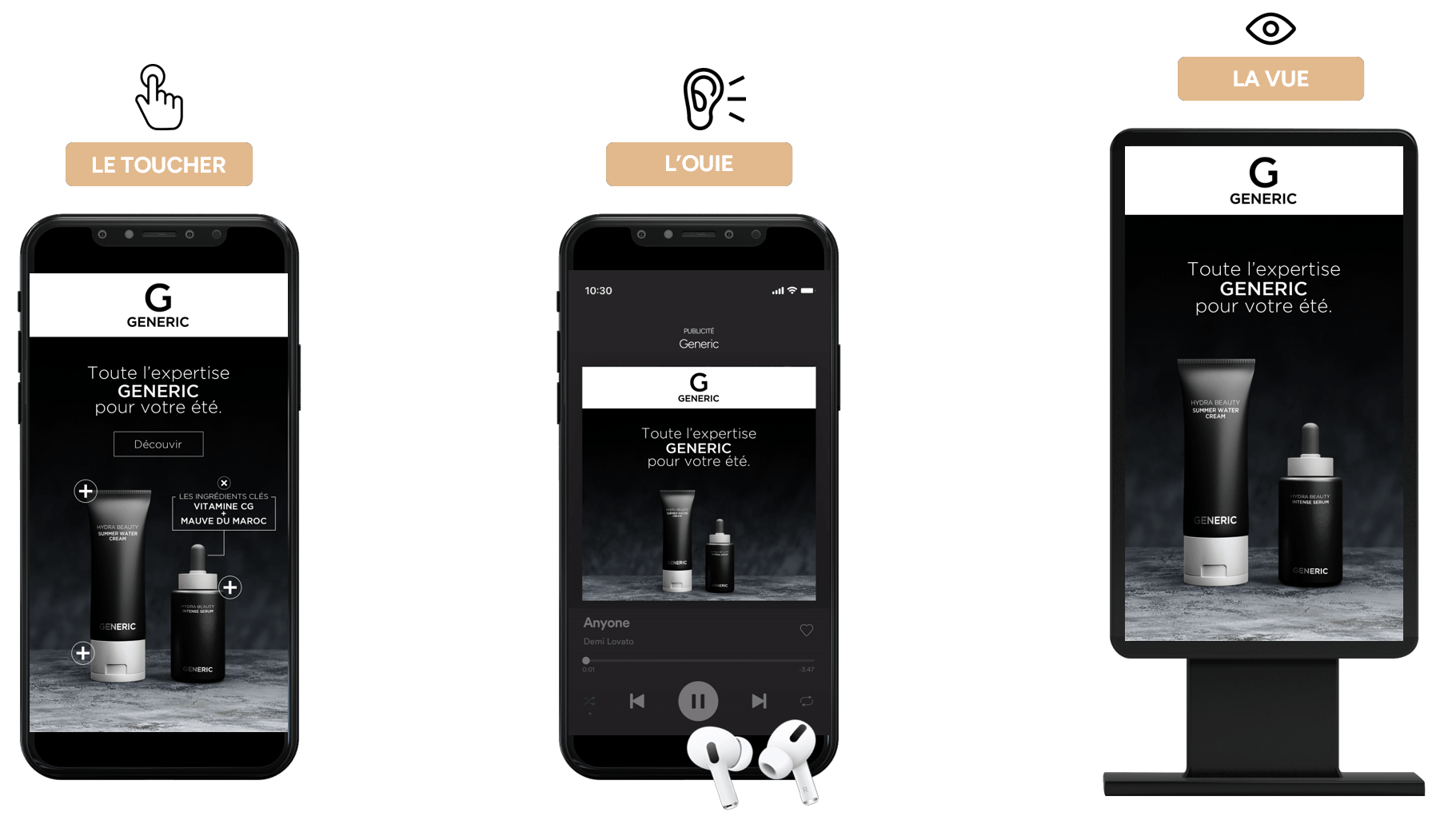 Pour faire plonger vos audiences au coeur de vos univers et faire découvrir vos produits à travers une expérience sensorielle, il est donc optimal de diffuser vos campagnes de façon omnicanale, avec des leviers faisant appel aux différents sens :